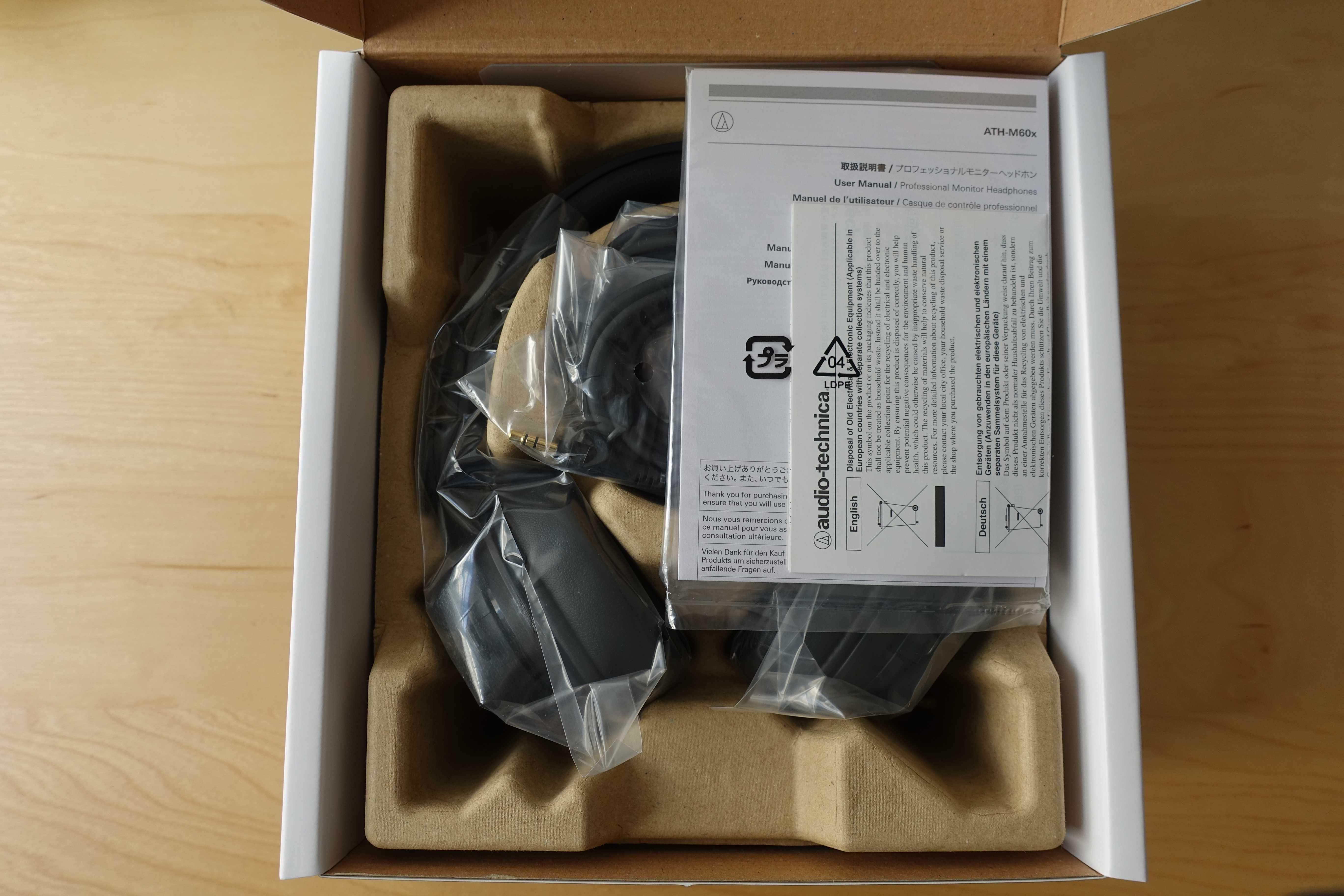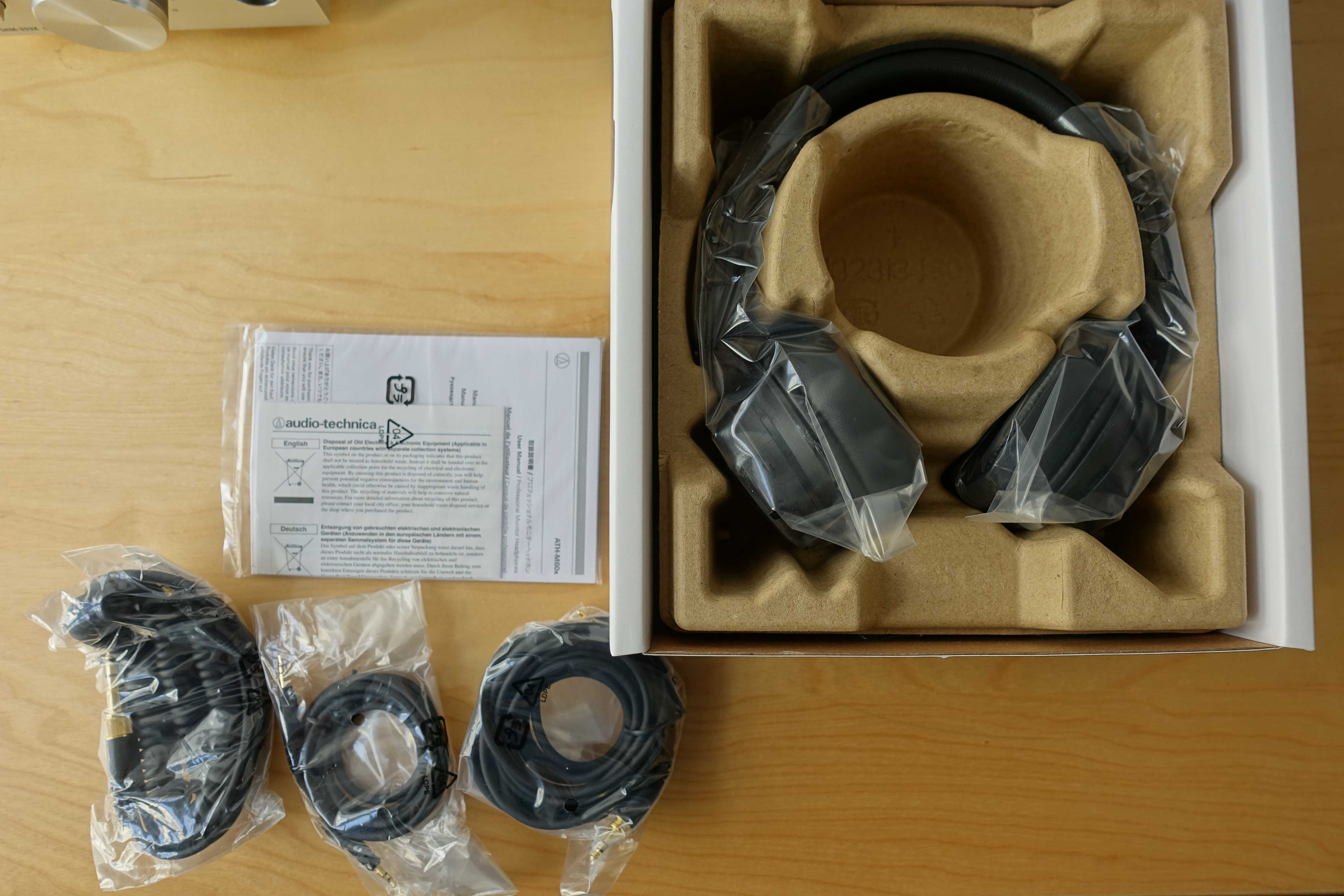 Sé que soy reiterativo pero me encantan el branding y embalaje de los Audio Technica. La caja es ideal para que tengamos bien protegidos nuestros auriculares y esta vez trae los cables enrollados sin el vaso de cartón que los cubre en los modelos previos.