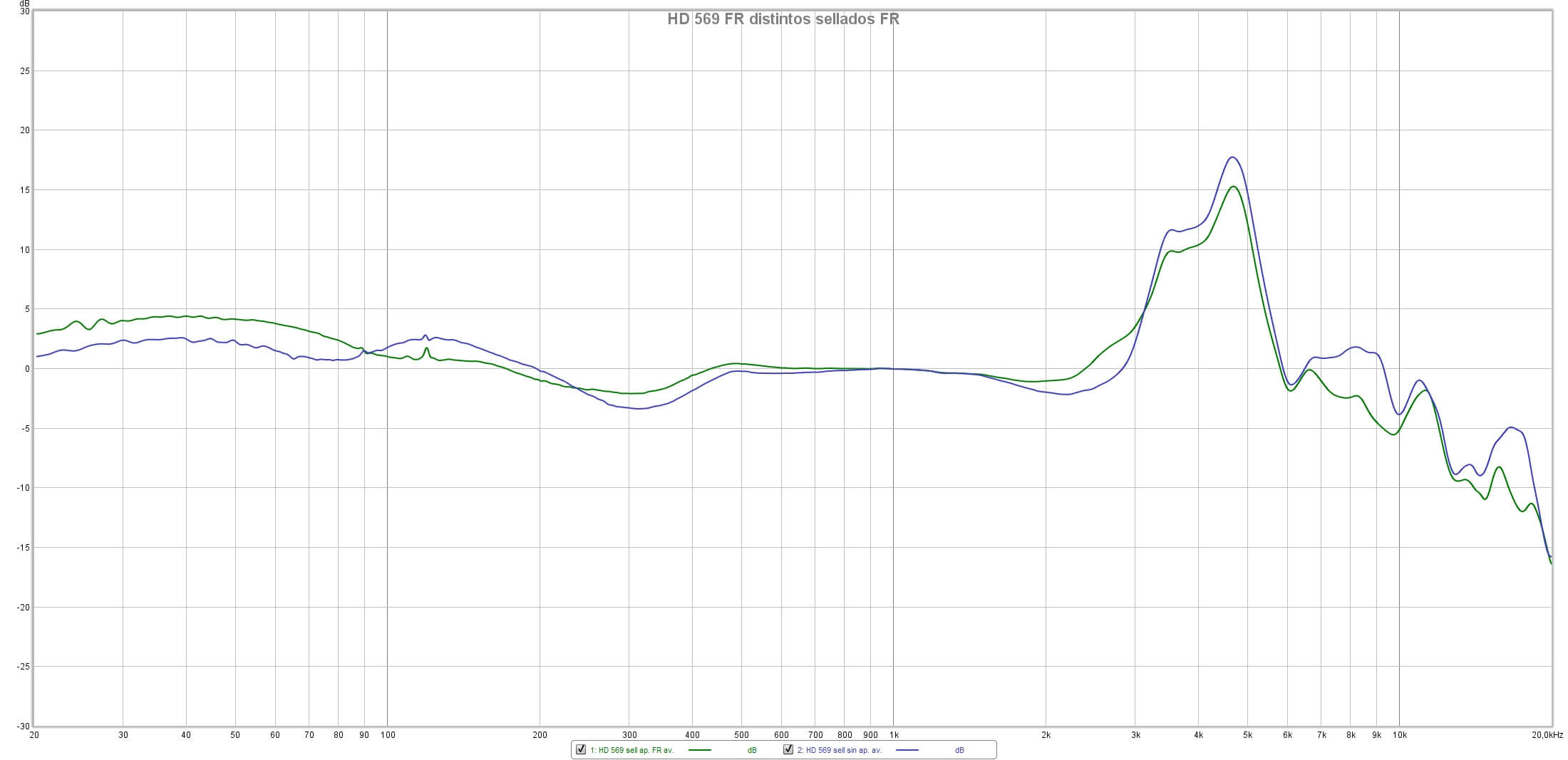Sennheiser HD 569: gráficas FR de distintos sellados (normal en morado, apretando en verde).