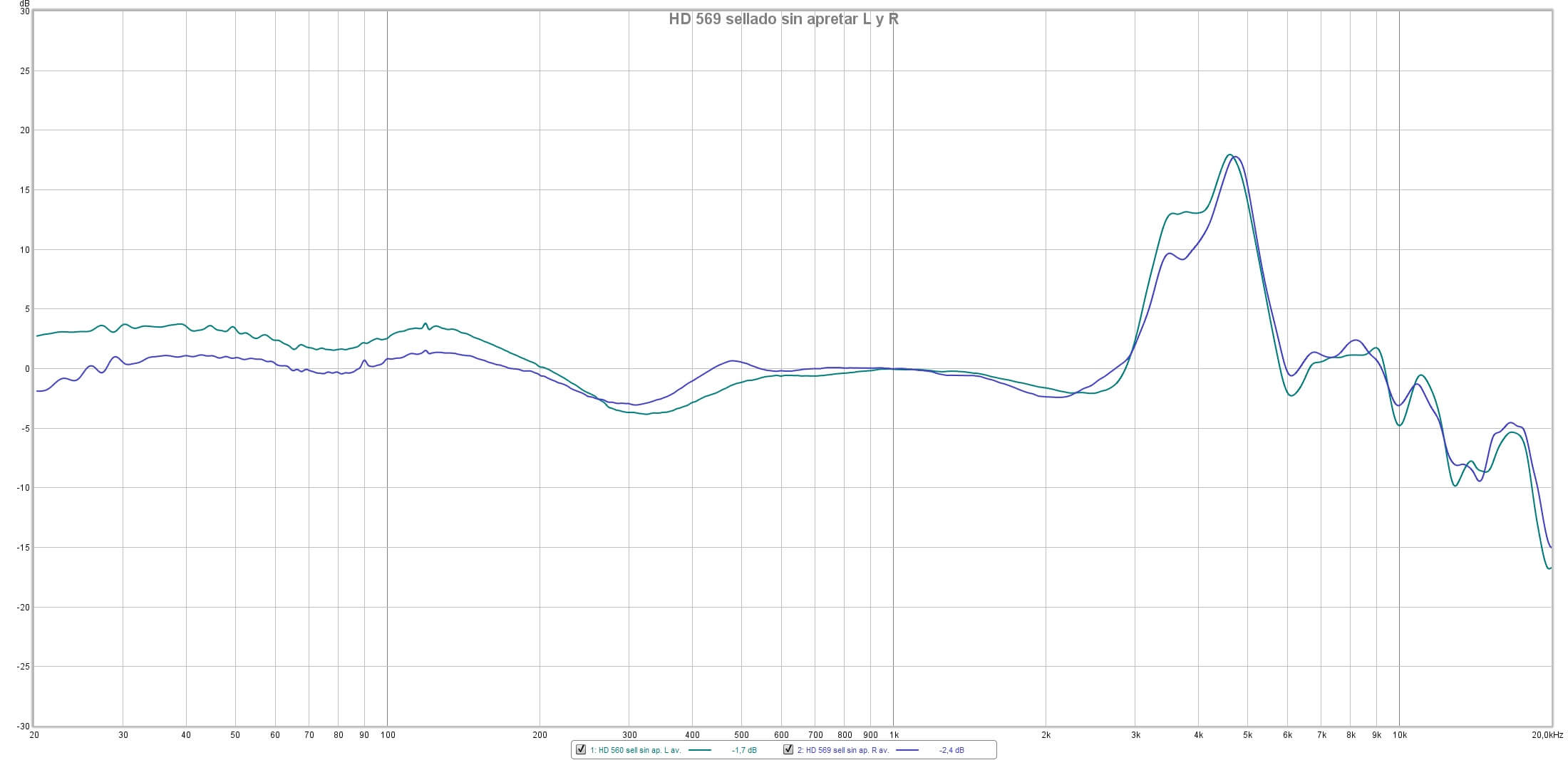 Sennheiser HD 569: sellado normal sin apretar, canales L (verde) y R (morado).