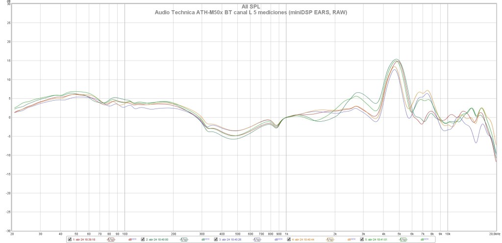 Audio Technica ATH-M50x BT, canal L 5 mediciones (miniDSP EARS, RAW).