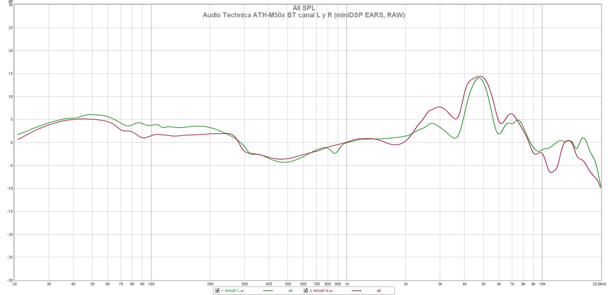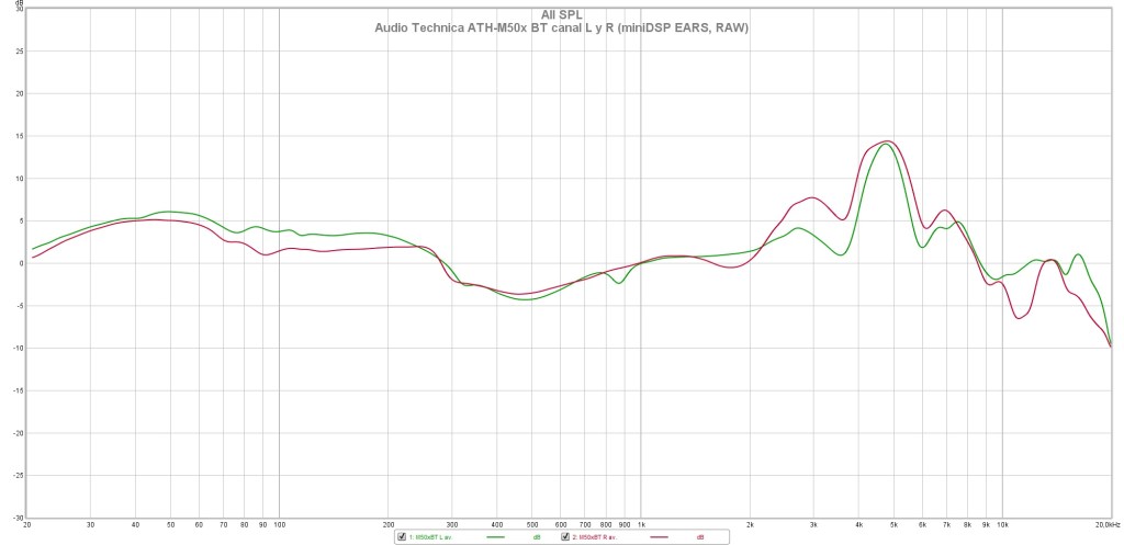 Audio Technica ATH-M50x BT, canales L (verde) y R (rojo), (miniDSP EARS, RAW).