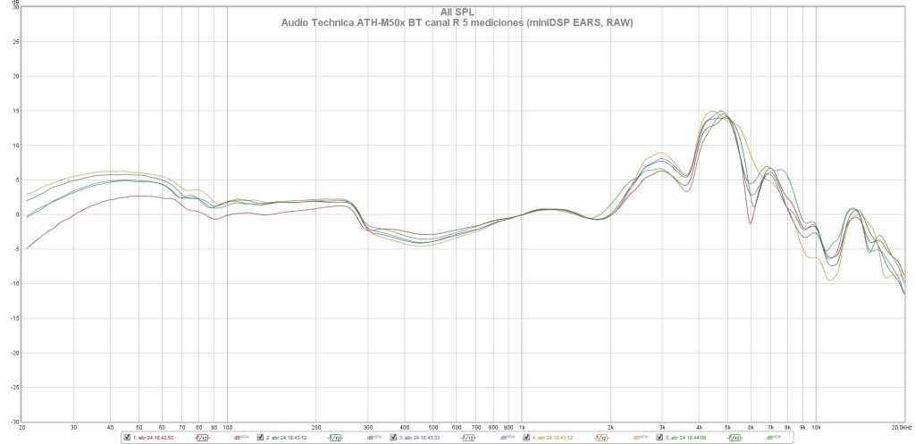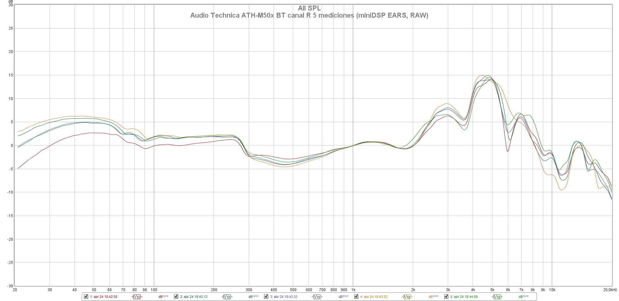 Audio Technica ATH-M50x BT, canal R 5 mediciones (miniDSP EARS, RAW).