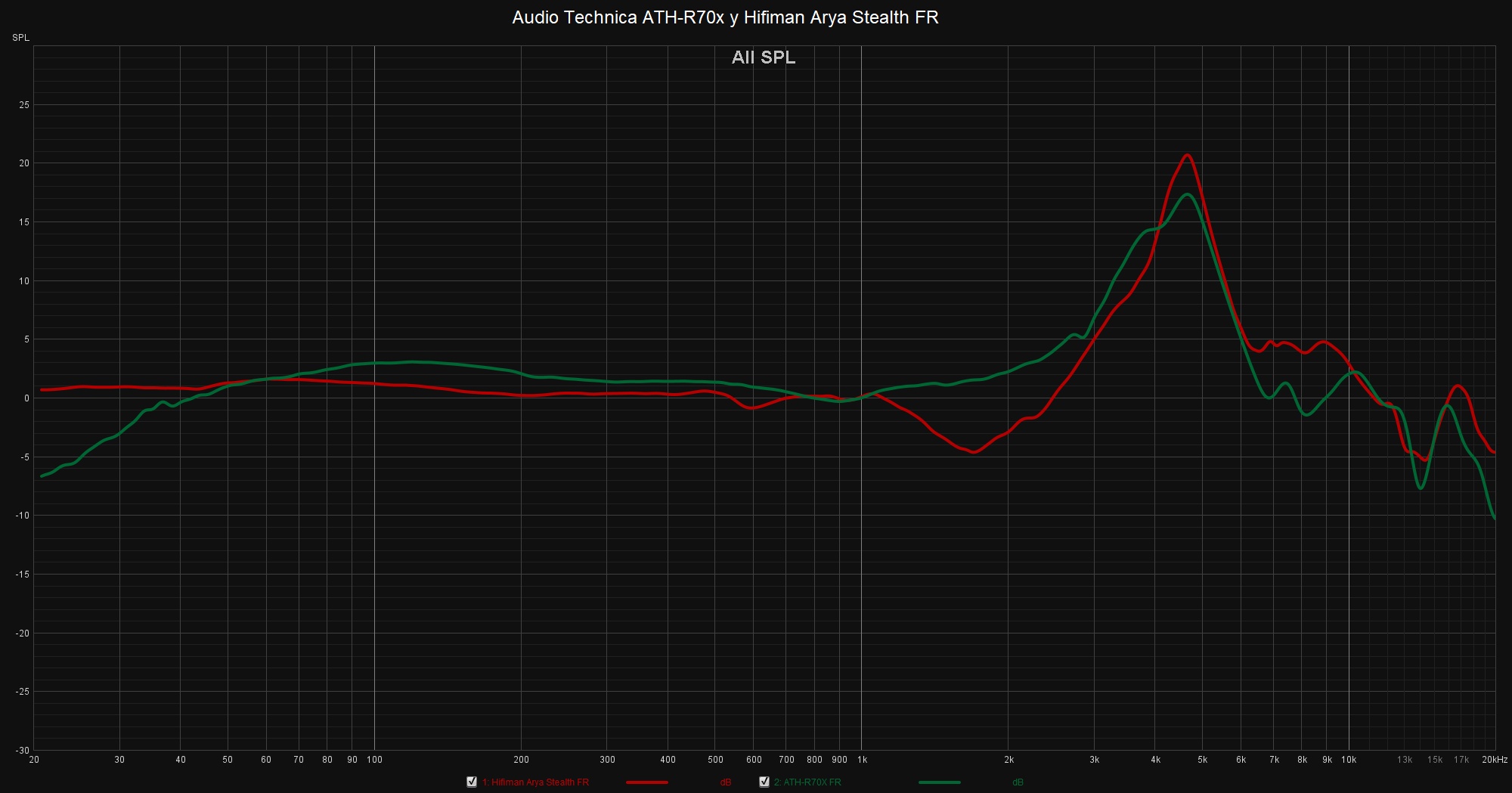 Se ve que los R70x tienen unos medios más prominentes en las frecuencias más graves pero al mismo tiempo se unen con mayor suavidad a los agudos sin esa depresión entre 1-2 kHz. Curiosamente en esa frecuencia es donde suelo escuchar cuando algo es «chillón» o «demasiado presente» pero no he sentido esa cualidad en los R70x.