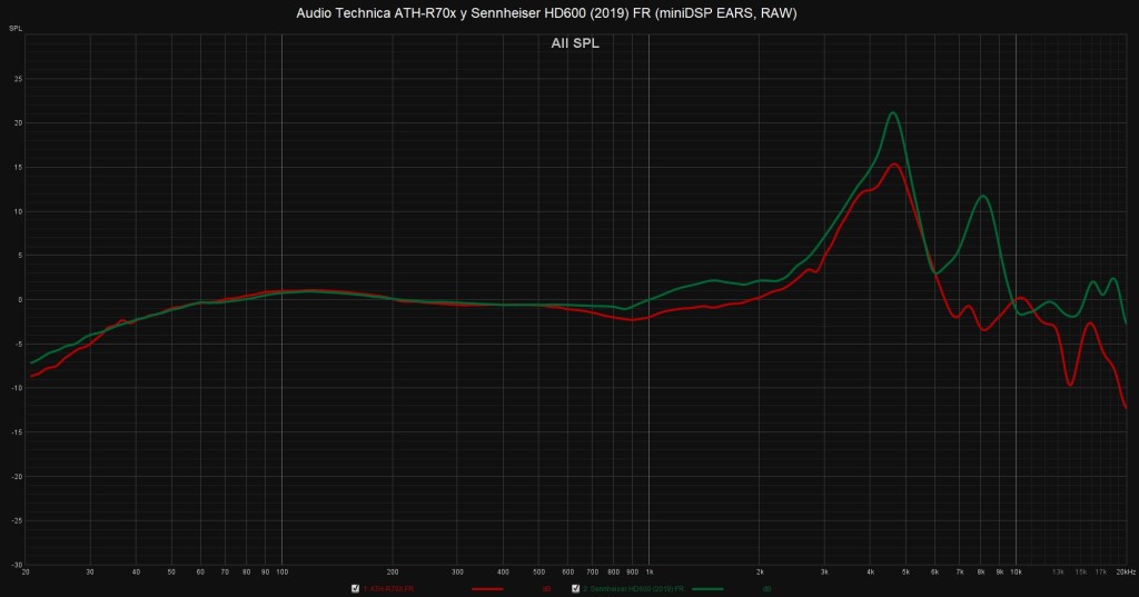 Los HD600 tienen más medios en esas frecuencias entre 1-3 kHz y desde luego dos picos importantes en agudos en 4,5 y 7 kHz que explican esa sensación de mayor brillo y cierta aspereza del sonido.