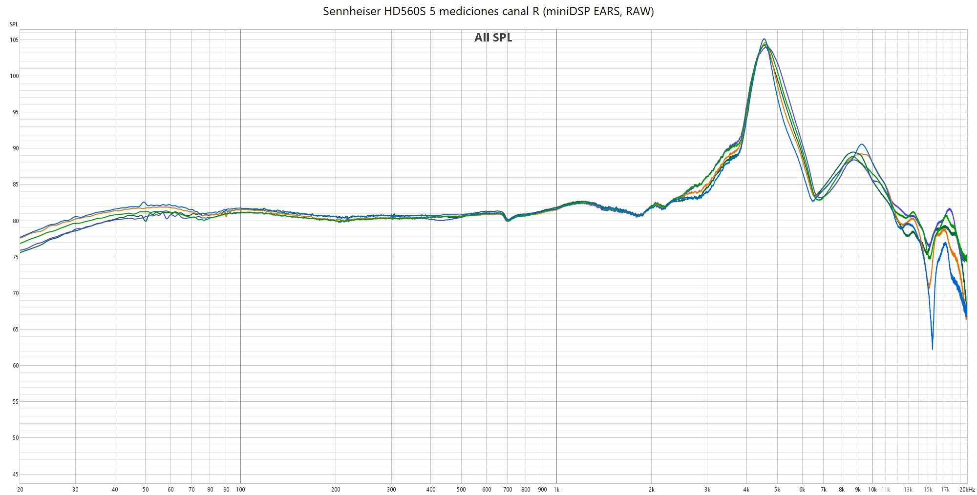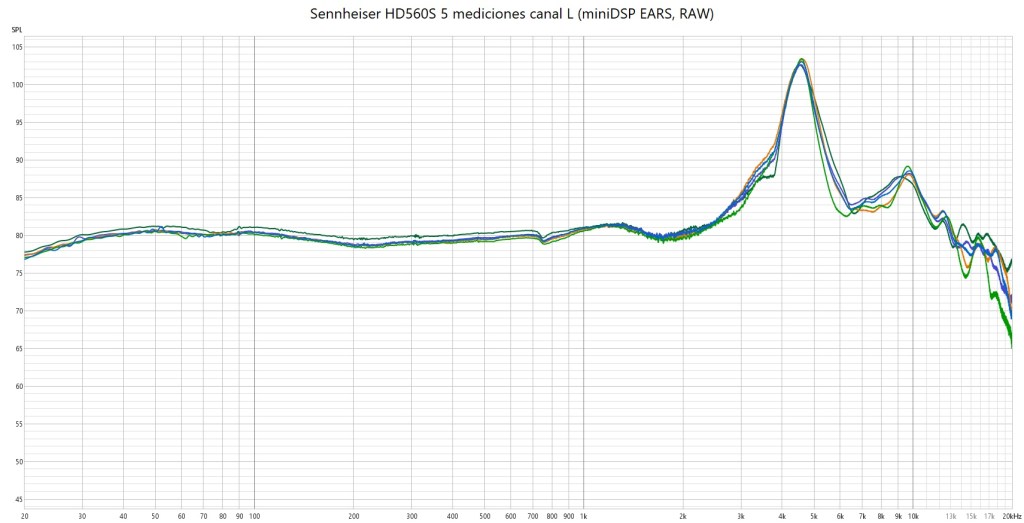 Sennheiser HD 560S, 5 mediciones canal R (miniDSP EARS, RAW)