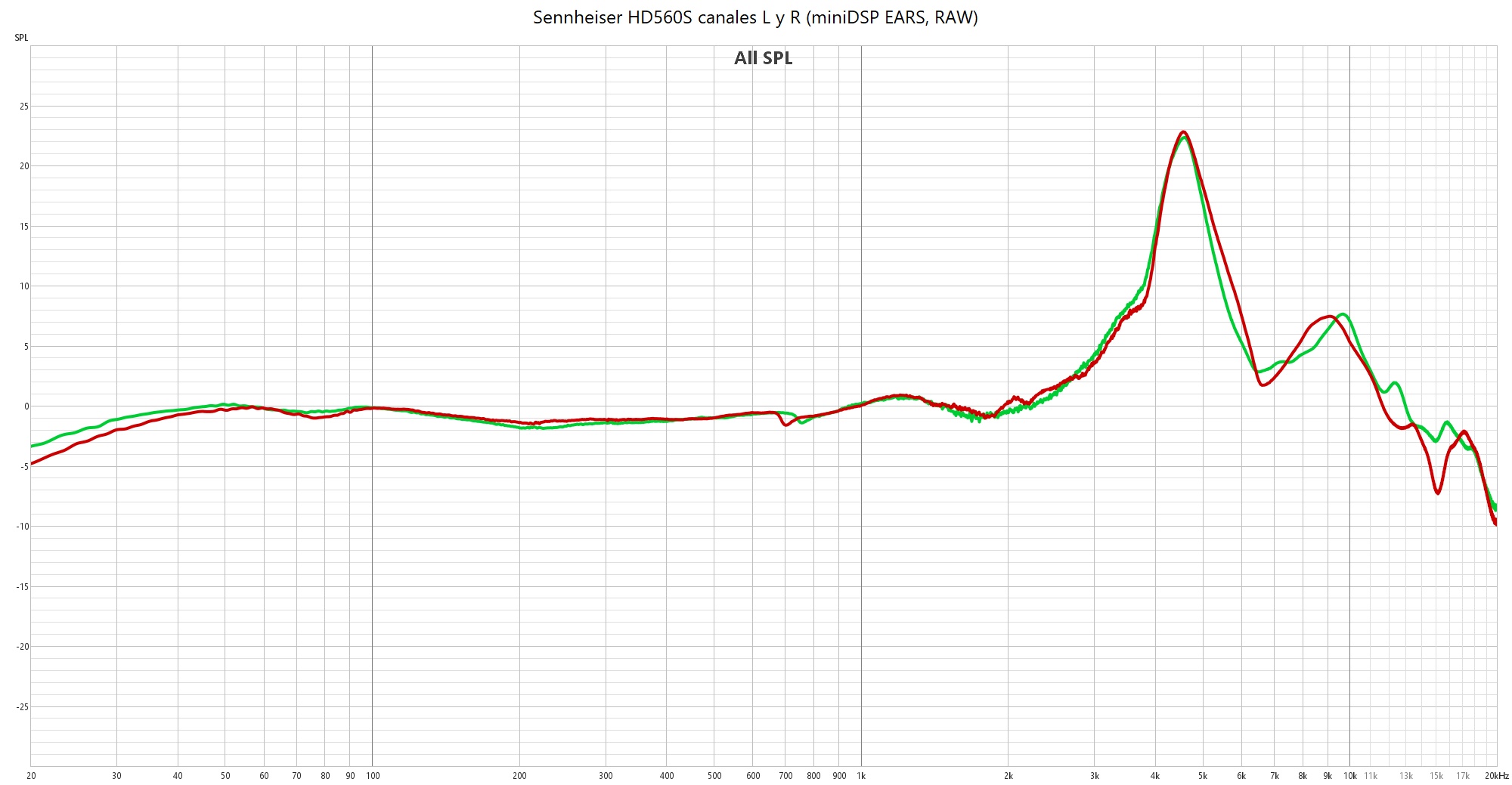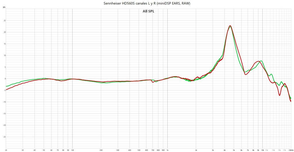 Sennheiser HD 560S, canales L (verde) y R (rojo) (miniDSP EARS, RAW).