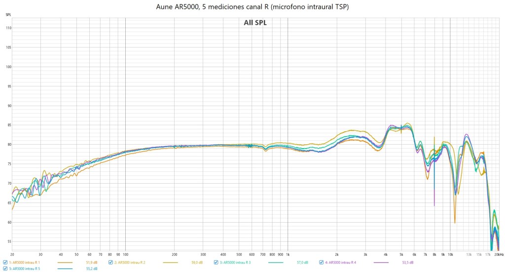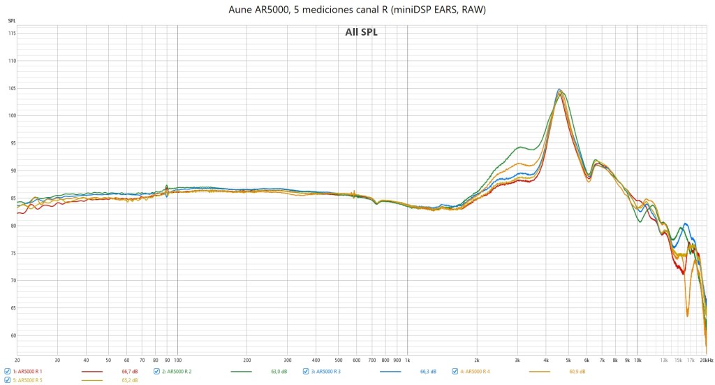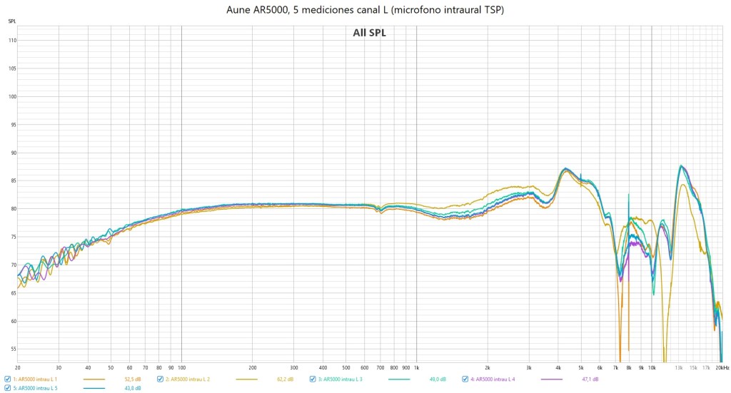 En las mediciones intraurales se detecta mayor variación en graves inferiores a 100 Hz y en medios entre 1-4 kHz de lo que se refleja en el miniDSP EARS, encontrándose una medición más constante en el pico entre 4-6 kHz que explicaría parte de la impresión percibida.