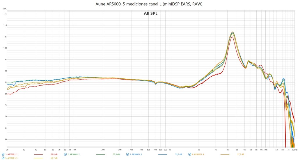 Las siguientes mediciones están realizadas con el miniDSP EARS y el Room EQ Wizard sin aplicar ninguna curva de compensación ni suavizado, no deben ser tomadas como medidas absolutas y han de valorarse con precaución.