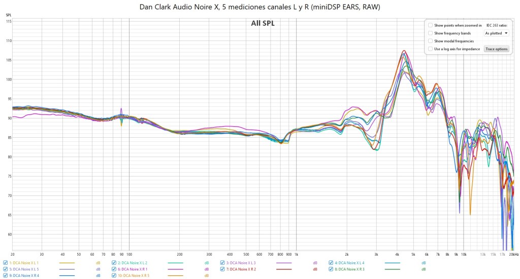 En las mediciones con el miniDSP EARS (con todas las limitaciones que conlleva) se aprecia la variabilidad según la posición donde coloque los auriculares, existiendo mayor elevación en 4,5 kHz y un valle en 3 kHz cuando los coloco pegados por delante y por arriba.