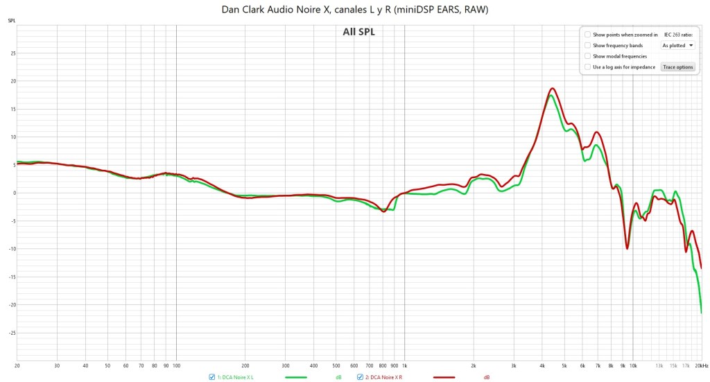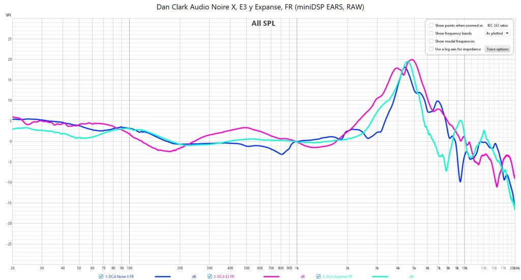 En la comparación de memoria que hago con los E3 parece confirmarse mi impresión. Los Noire X tienen menor energía en el rango que va de 2-4,5 kHz así como ausente ese pico en torno a 5 kHz.