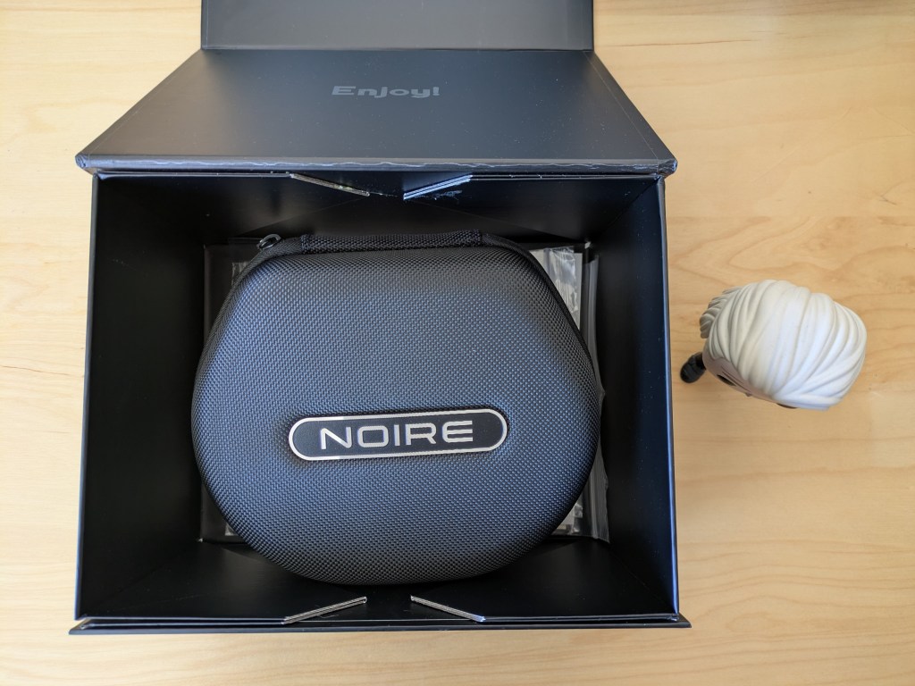 Los Noire X vienen en una cajita pequeña de color negro donde encontraremos el certificado de autenticidad (indispensable para hacer valer la garantía), hoja de instrucciones, el cable en una bolsita de tela y la funda semirrígida con los auriculares plegados y la pieza de foam entre copas para evitar que las almohadillas se deformen al tenerlos guardados.